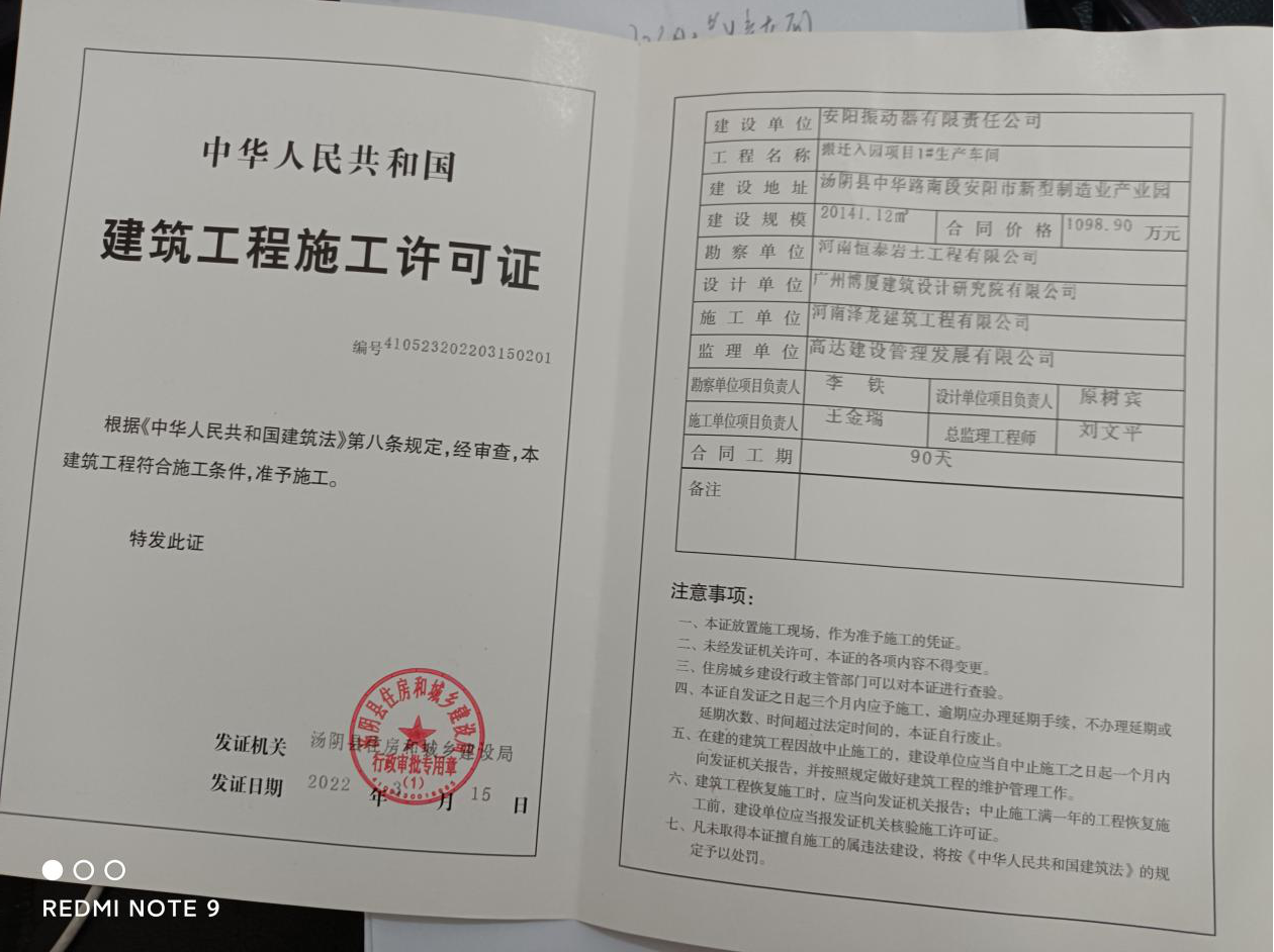 繼2020年9月湯陰·安陽振動(dòng)器有限責(zé)任公司智能制造項(xiàng)目簽約儀式在縣政府第二會(huì)議室舉行后。2021年3月4日安陽振動(dòng)器有限責(zé)任公司湯陰新廠建設(shè)開工儀式如約進(jìn)行后,2022年3月15日,安陽振動(dòng)器有限責(zé)任公司獲得新廠建設(shè)施工許可證。這將有利于我廠智能制造項(xiàng)目的快速開展。